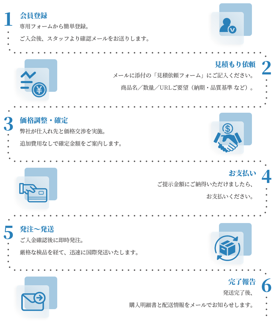 お申し込みから商品お届けまで、わかりやすいステップでサポートいたします。